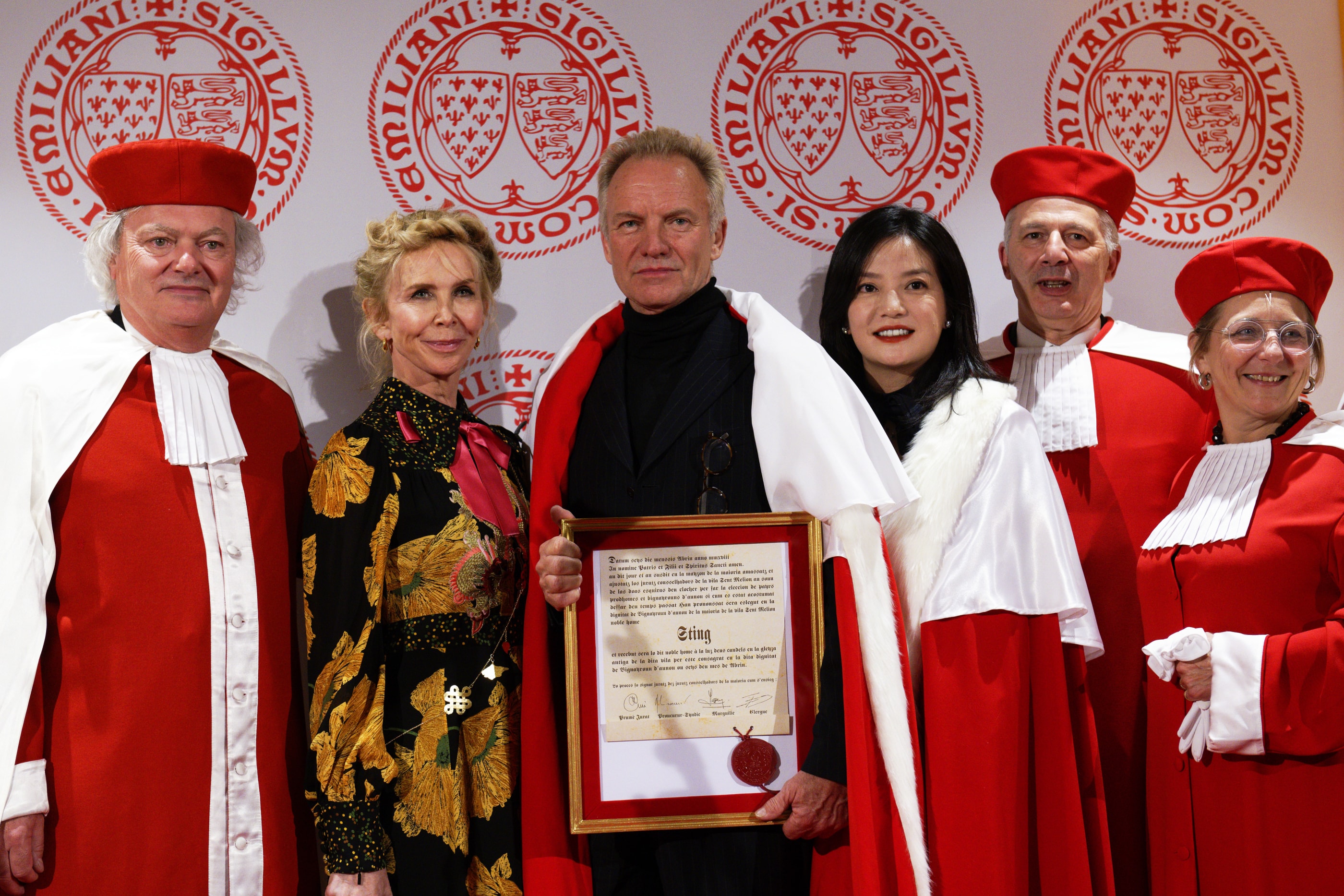 La jurade de Saint-Émilion a intronisé Sting lors de l’inauguration du Château Monlot, propriété appartenant à l’actrice chinoise Zhao Wei le 6 avril 2018, après de nombreux travaux de rénovation.